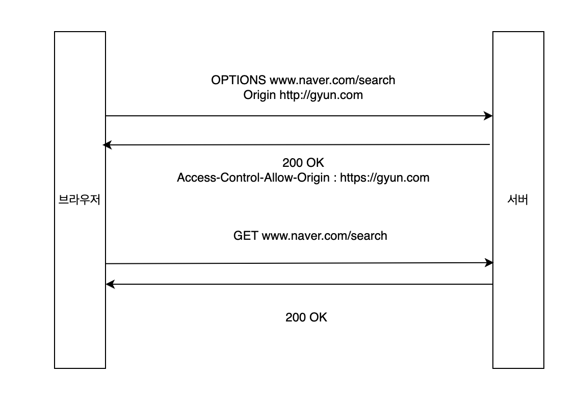 - 접근하려는 origin/자원에 브라우저(클라이언트 app)의 origin이 무엇인지 OPTION 메소드로 보낸다.