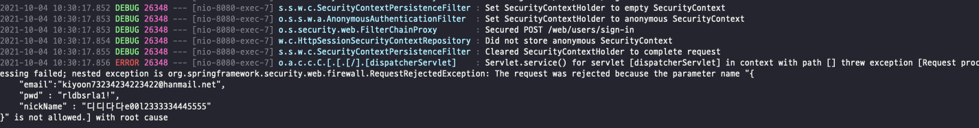 spring security가 무언가 계속 오류를 내뱉는 것 같았다. 또한 firewall에서 RequestRejectException을 계속 예외로 던지고 있어서 controller에 가기 전에 막힌다는 생각을 했다.