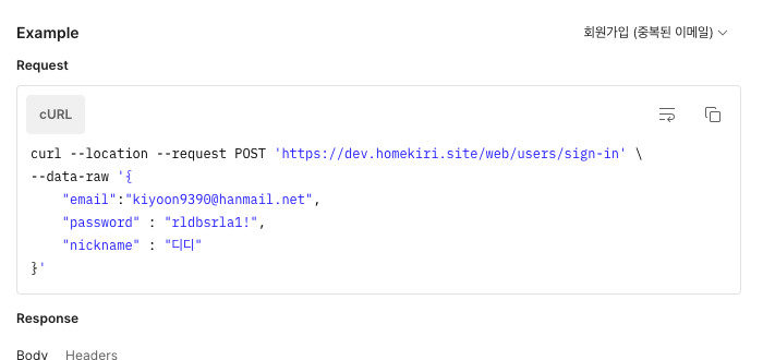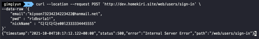 curl -X POST http://dev.homekiri.site/web/users/sign-in -H 'Content-Type: application/json' -d '{"email":"kiyoon73234234223422@hanmail.net","pwd" : "rldbsrla1!", "nickName" : "디디다다e00l2333334445555"}'