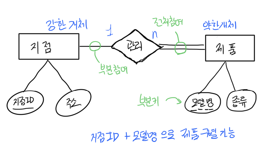 "관리"라는 관계에 제품은 반드시 참여해야하는 개체 인스턴스