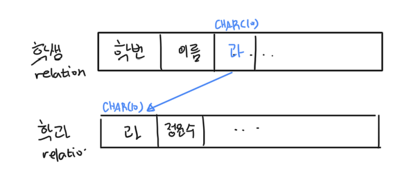 외래키의 속성 이름과 참조하고 있는 기본키 속성의 이름이 달라도 되지만 도메인은 같아야 함