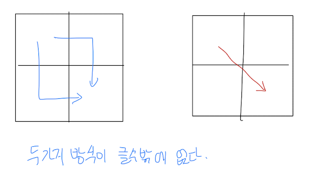 따라서 대각선 방향으로 이동하는 것보다 이미 대각선 방향을 거치고 오는 경우(거치고 옆을 돌아서 오는 것)가 더 많은 사탕을 가질 수 있음
