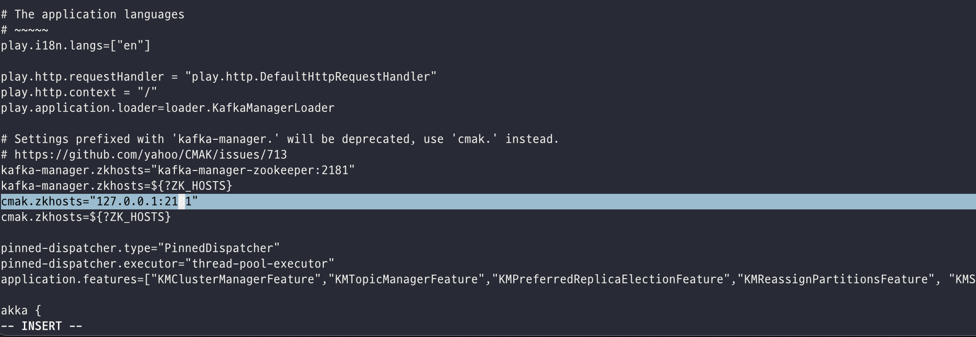 cmak.zkhosts = "zookeeper가 실행되는 컴퓨터의ip : 2181" 을 설정해주어야 함